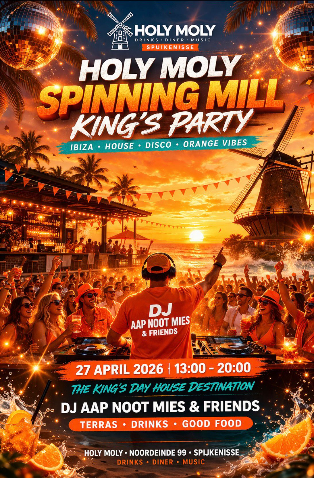 27 April Holy Moly Kingsday de Luxe, kom gezellig langs op ons terras of binnen in de molen. Lekker eten en drinken!