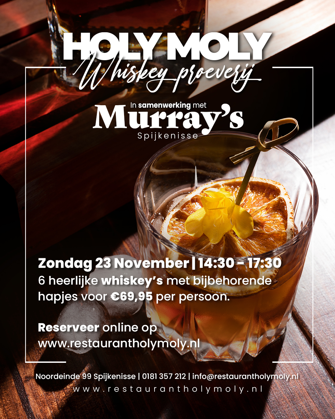 Op 23 november organiseren wij een whiskey proeverij in samenwerking met Murray’s Spijkenisse. Geniet deze avond van verschillende whiskey’s en hapjes.