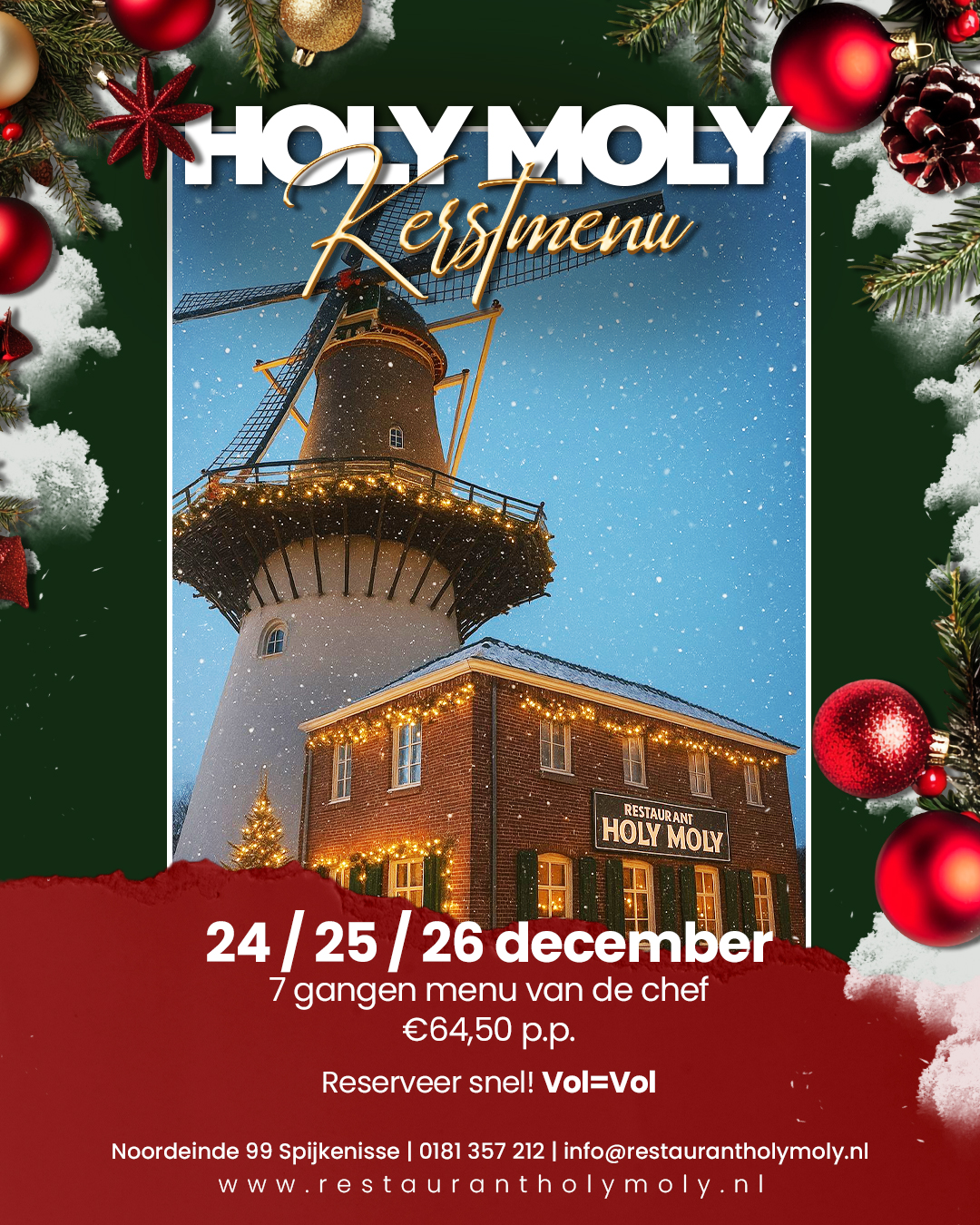 Het is bijna zover, de meest magische tijd van het jaar komt eraan! Neem je familie en vrienden mee voor een feestelijk kerstdiner bij HolyMoly. Laat je verrassen door ons 7 gangen kerstmenu van de chef voor €64,50 p.p.